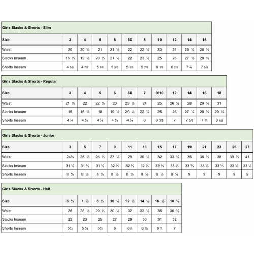 - Youth Inseams: 4- 6.75”, 5- 7.25”, 6- 7.75”, 6x- 8”, 7- 7.5”, 8- 8”, 10-8.5”, 12- 9”, 14- 9.5”, 16- 10”, 18- 10.5”, 20- 11”