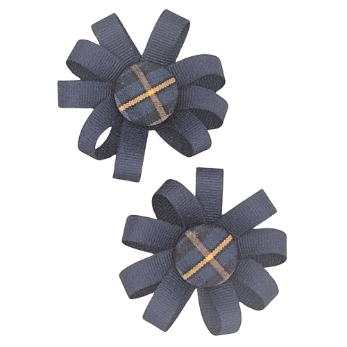 Round Pigtail Ribbon Button Bows w/Plaid Center on Pinch clip. Approximately 3" wide.